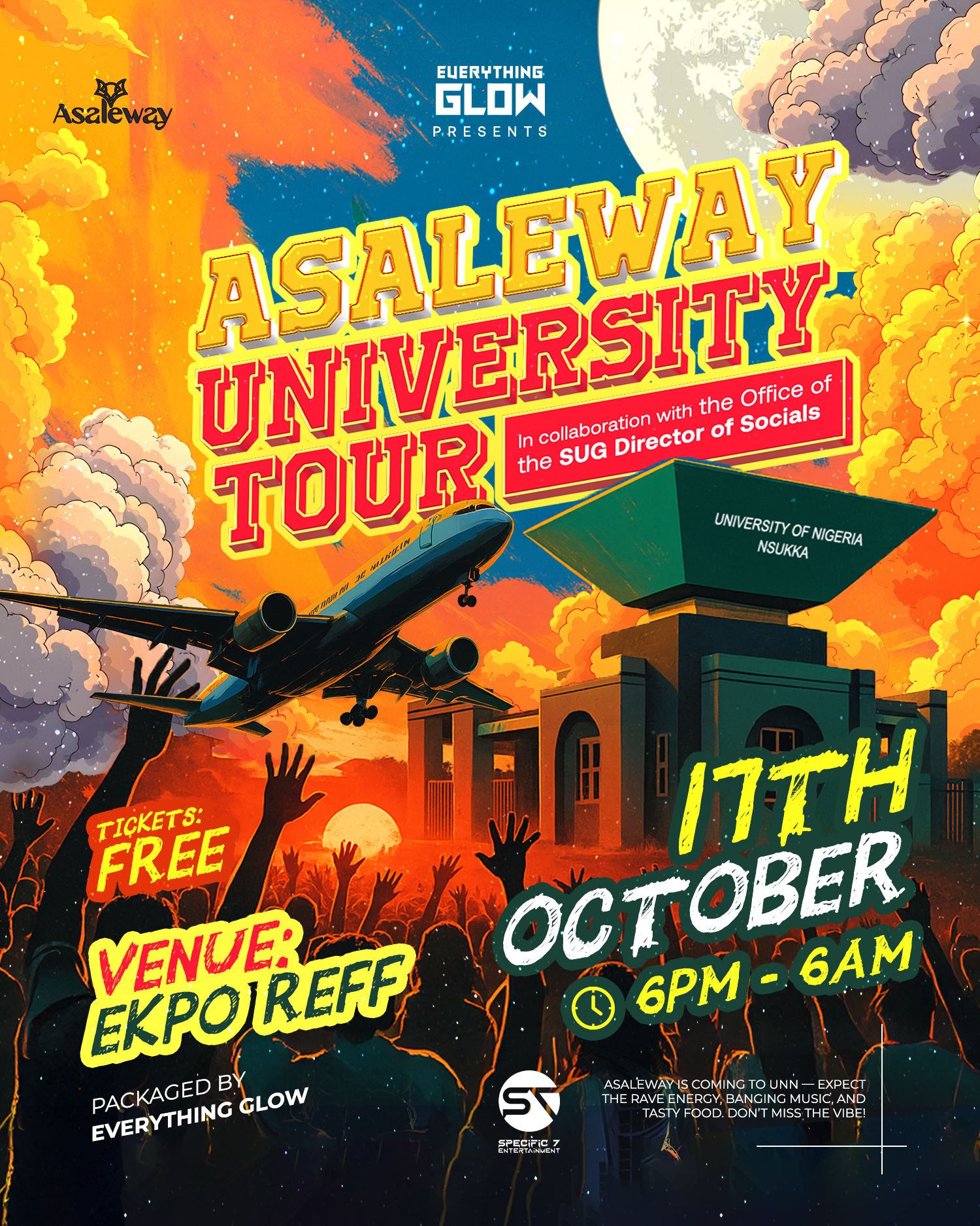 The Asaleway University Tour is set to bring an unforgettable wave of energy, music, and excitement to campuses across Nigeria, with its next stop at the University of Nigeria, Nsukka (UNN). Packaged by Everything Glow in collaboration with the Office of the SUG Director of Socials, this event is more than just a show; it’s a cultural experience that blends music, fun, and youthful expression into one vibrant night.